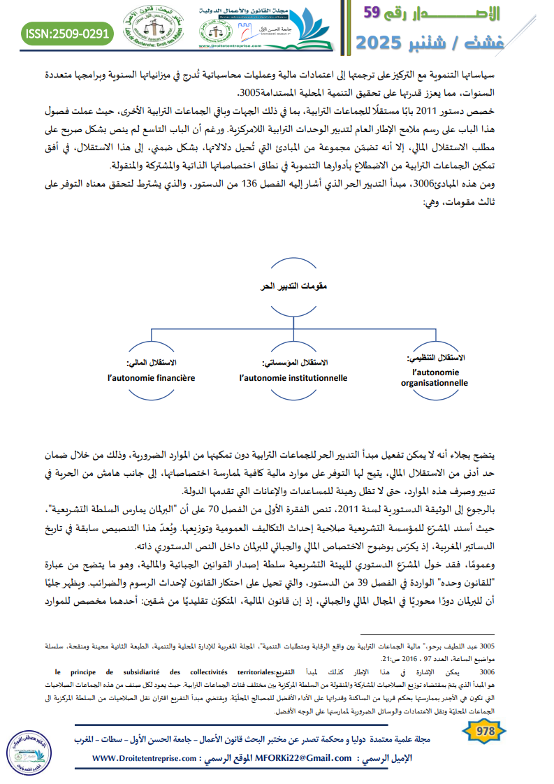 ومن هذه المبادئ[5]، مبدأ التدبير الحر الذي أشار إليه الفصل 136 من الدستور، والذي يشترط لتحقق معناه التوفر على ثالث مقومات، وهي: