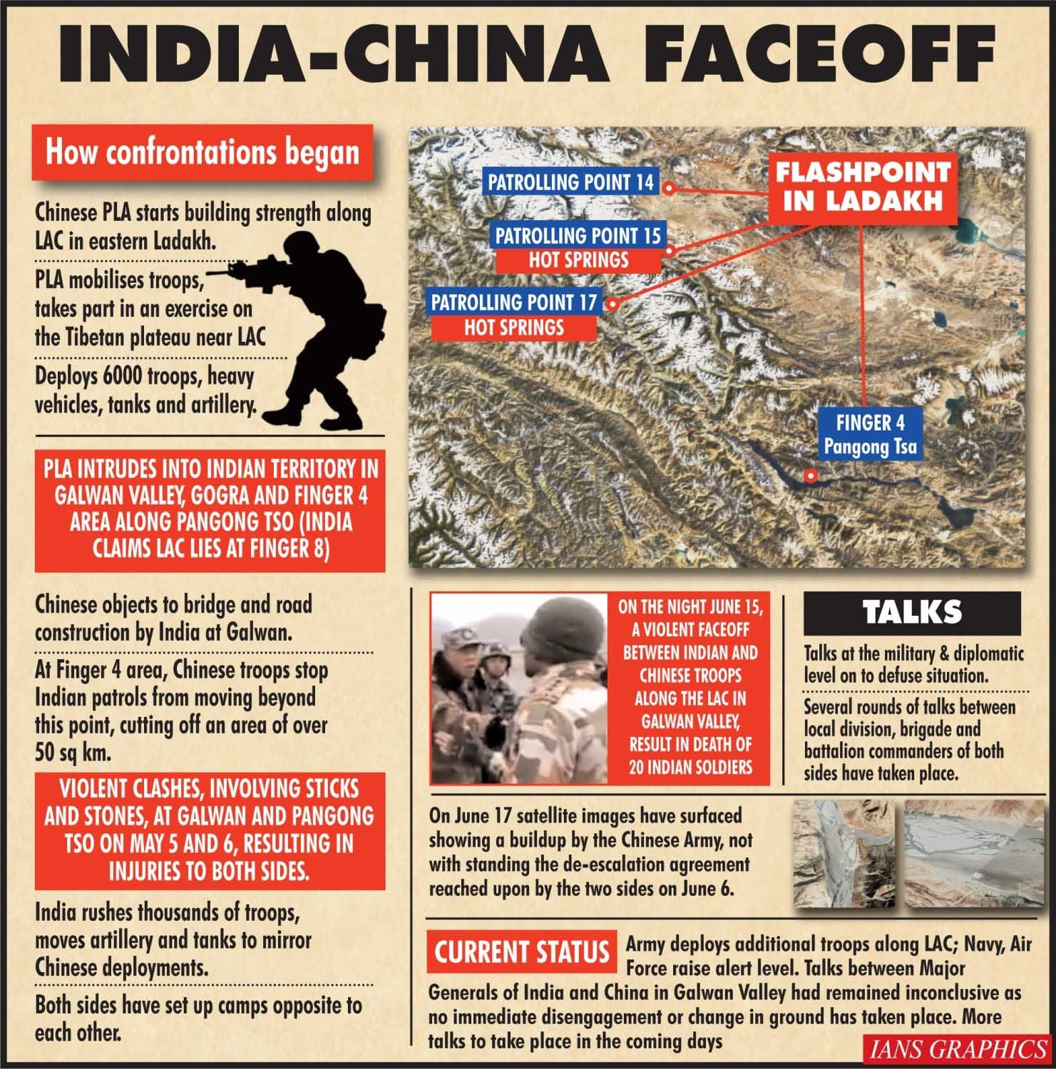 الراهن في أربعة أماكن في شرق لاداخ اعترضت عليه الهند. نقاط المواجهة الأربع هي Finger Finger في الضفة الشمالية لبحيرة Pangong ، ونقطة