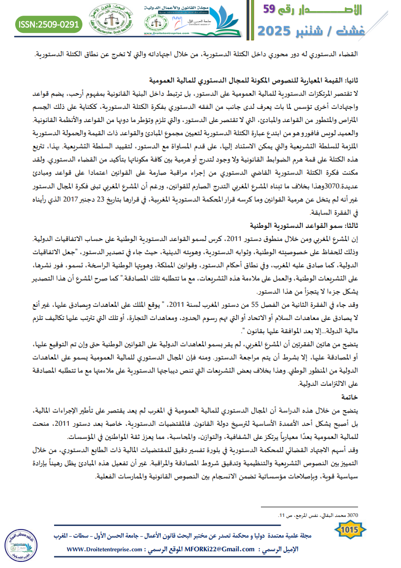وقد أسهم الاجتهاد القضائي للمحكمة الدستورية في بلورة تفسير دقيق للمقتضيات المالية ذات الطابع الدستوري، من خلال التمييز بين النصوص التشريعية والتنظيمية وتدقيق شروط المصادقة والمراقبة. غير أن تفعيل هذه المبادئ يظل رهيناً بإرادة سياسية قوية، وبإصلاحات مؤسساتية تضمن الانسجام بين النصوص القانونية والممارسات الفعلية.