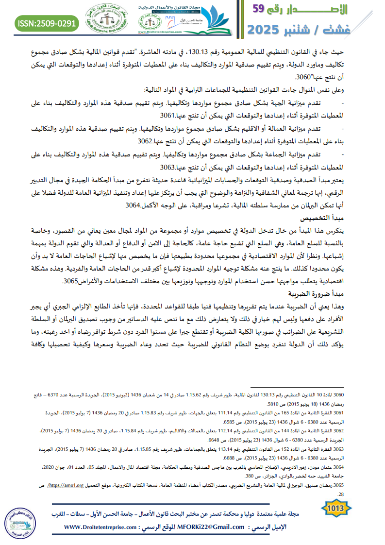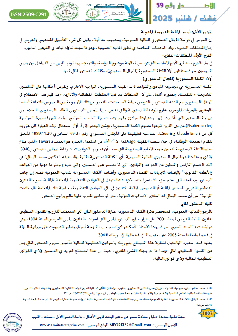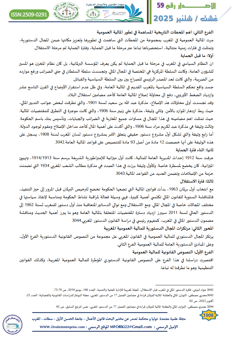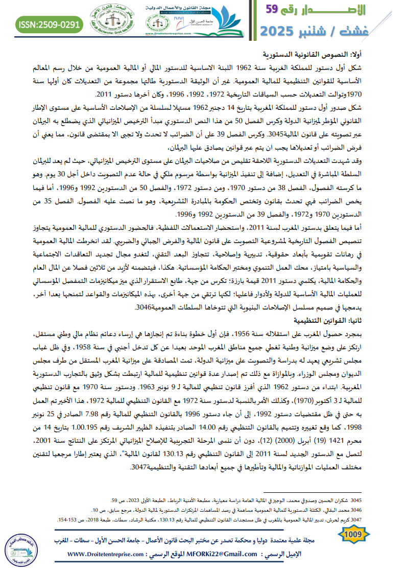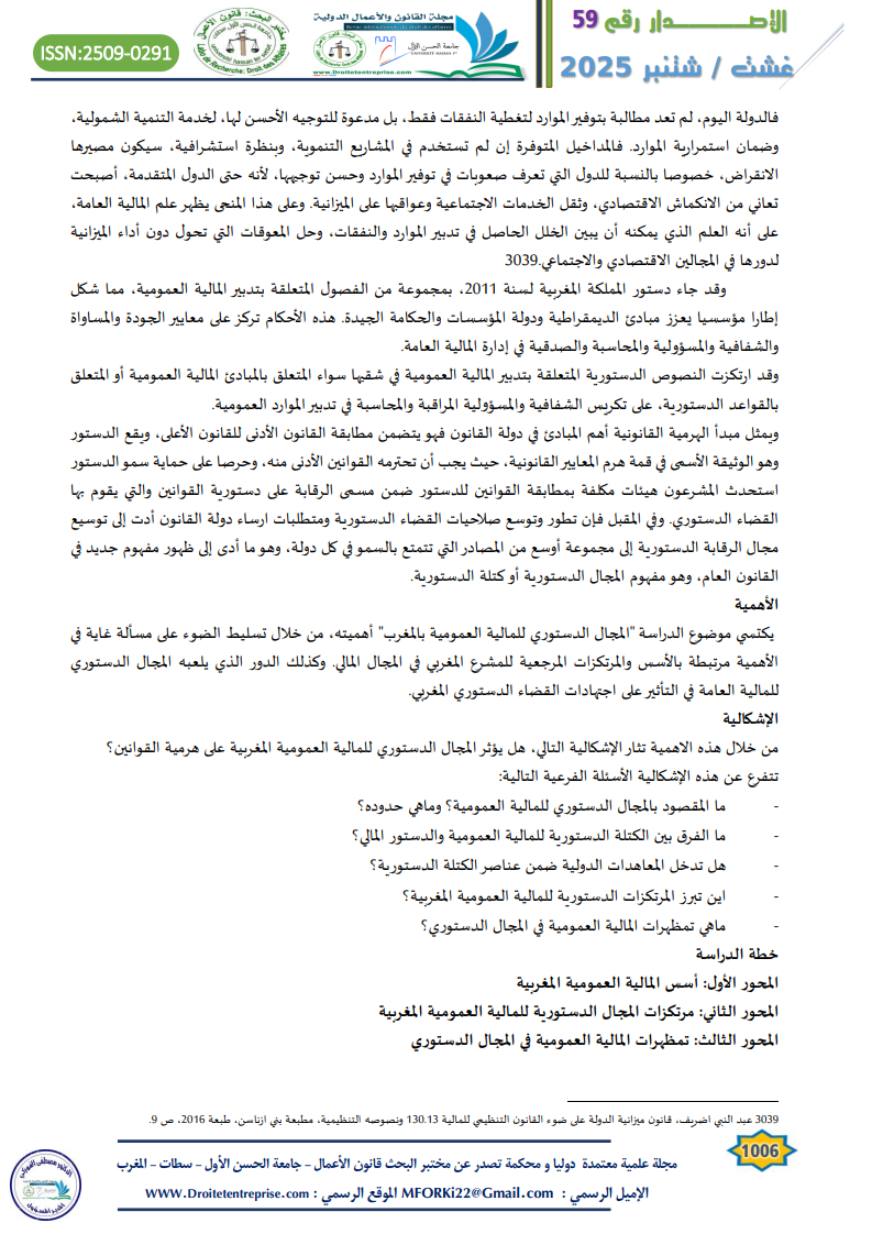 The constitutional domain of public finance in Morocco defines the legal and institutional rules governing state financial activity. It is based on the Constitution of 2011, related organic laws, and constitutional jurisprudence. This domain includes not only the constitutional text but also the broader “constitutional bloc” concept. Key principles such as budgetary balance, annuality, transparency, credibility, and tax fairness are central. Public finance in Morocco has evolved through three stages: pre-protectorate, protectorate, and post-independence. Since 1962, financial legislation has gradually become constitutionalized. The 2011 Constitution marked a turning point by integrating over 30 articles related to public finance and financial governance. It emphasizes accountability, performance-based budgeting, and fiscal discipline. Despite Morocco’s adherence to international treaties, national constitutional supremacy is maintained. Ultimately, this framework ensures responsible public financial management and safeguards the public interest.