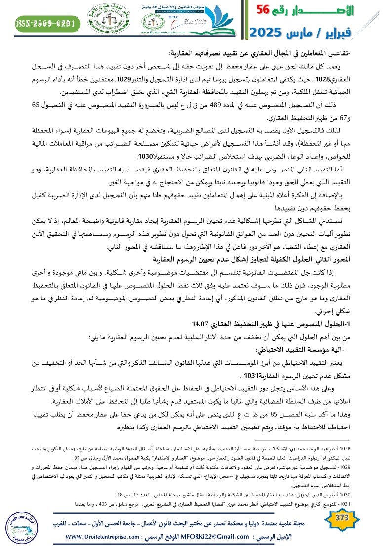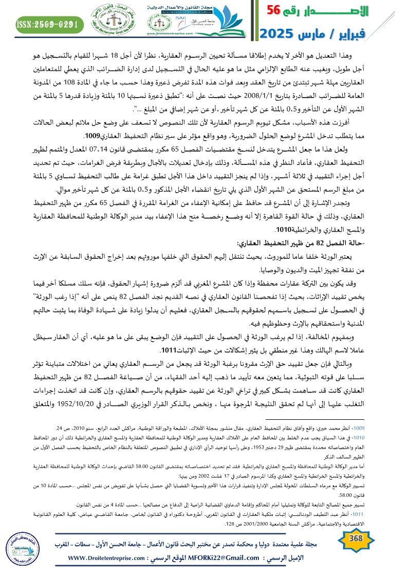 وهذا التعديل هو الأخر لا يخدم إطلاقا مسألة تحيين الرسوم العقارية، نظرا لأن أجل 18 شهرا للقيام بالتسجيل هو أجل طويل، ويغيب عنه الطابع الإلزامي مثل ما هو عليه الحال في التسجيل لدى إدارة الضرائب الذي يعطي للمتعاملين العقاريين مهلة شهر تبتدئ من تاريخ العقد وبعد فوات هذه المدة تفرض ذعيرة وهذا حسب ما جاء في المادة 108 من المدونة العامة للضرائب الصادرة بتاريخ 1/1/2008 حيث نصت على أنه :”تطبق ذعيرة نسبتها 10 بالمئة وزيادة قدرها 5 بالمئة من الشهر الأول عن التأخير و0،5 بالمئة عن كل شهر تأخير ،أو عن شهر إضافي من المبلغ …”.