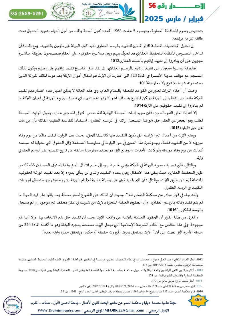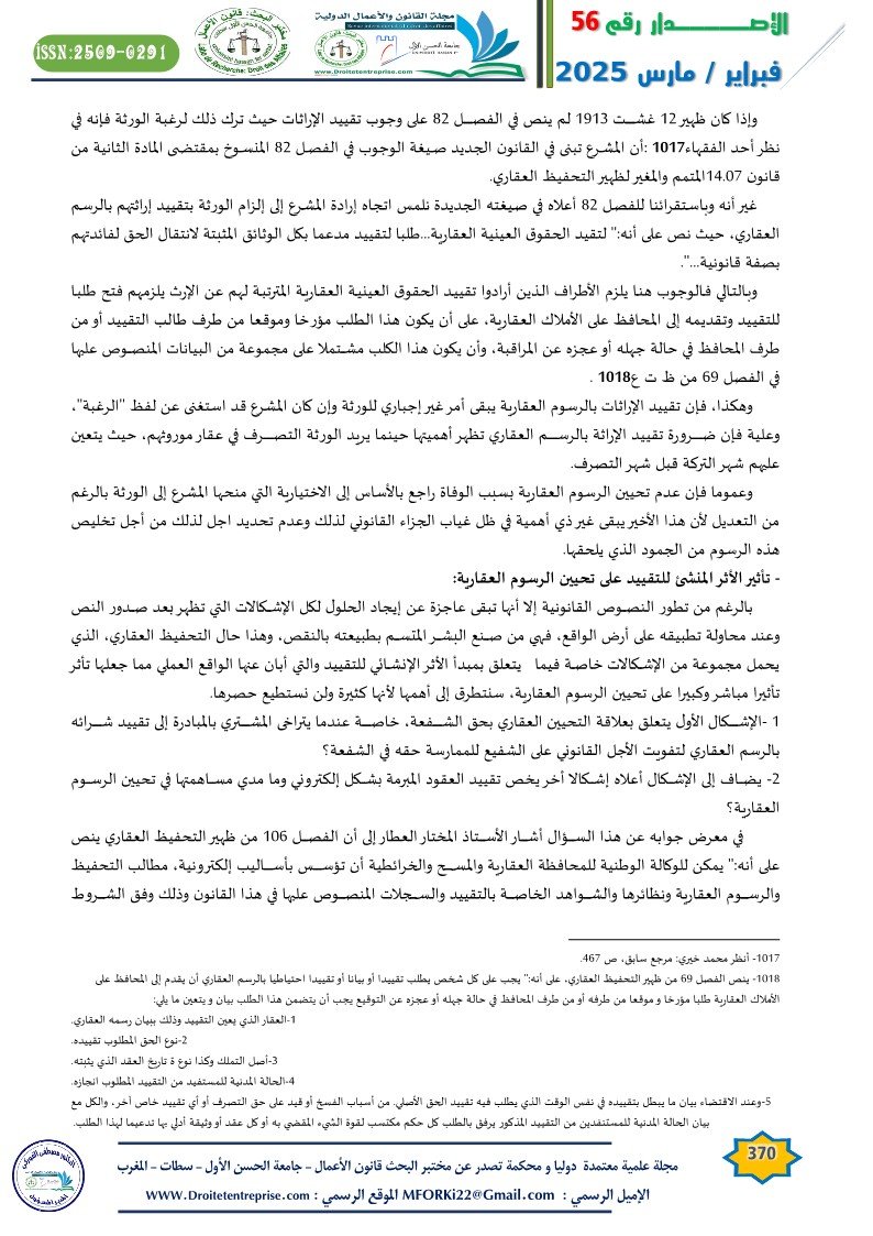 فالورثة ليسوا مجبرين على تقييد إراثتهم بالرسم العقاري، بل لقد علق المشرع تقييد إراثتهم على رغبتهم ويكون بذلك انسجم مع موقف مدونة الأسرة في المادة 323 التي اعتبرت أن الإرث هو انتقال أموال التركة بعد موت المالك للورثة الذين يستحقونه شرعا بلا تبرع ولا معاوضة .