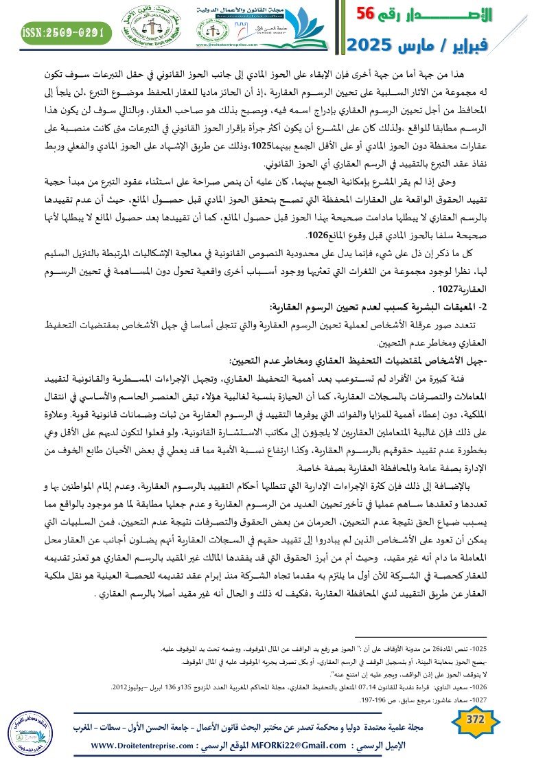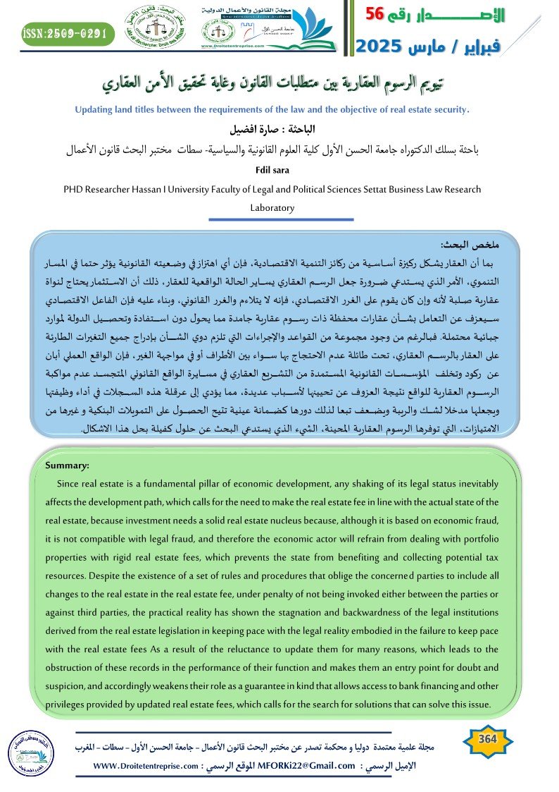 Since real estate is a fundamental pillar of economic development, any shaking of its legal status inevitably affects the development path, which calls for the need to make the real estate fee in line with the actual state of the real estate, because investment needs a solid real estate nucleus because, although it is based on economic fraud, it is not compatible with legal fraud, and therefore the economic actor will refrain from dealing with portfolio properties with rigid real estate fees, which prevents the state from benefiting and collecting potential tax resources. Despite the existence of a set of rules and procedures that oblige the concerned parties to include all changes to the real estate in the real estate fee, under penalty of not being invoked either between the parties or against third parties, the practical reality has shown the stagnation and backwardness of the legal institutions derived from the real estate legislation in keeping pace with the legal reality embodied in the failure to keep pace with the real estate fees As a result of the reluctance to update them for many reasons, which leads to the obstruction of these records in the performance of their function and makes them an entry point for doubt and suspicion, and accordingly weakens their role as a guarantee in kind that allows access to bank financing and other privileges provided by updated real estate fees, which calls for the search for solutions that can solve this issue.