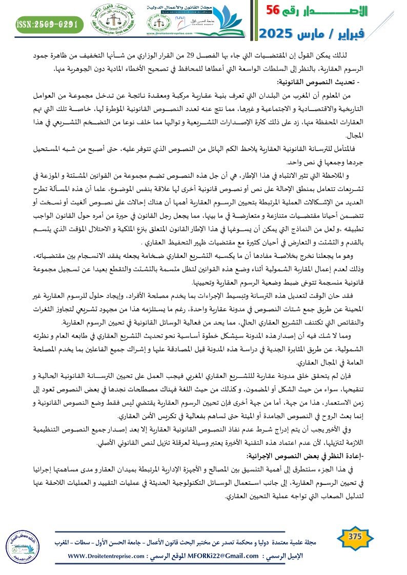 فقد حان الوقت لتعديل هذه الترسانة وتبسيط الإجراءات بما يخدم مصلحة الأفراد، وإيجاد حلول للرسوم العقارية غير المحينة عن طريق جمع شتات النصوص في مدونة عقارية واحدة، رغم ما يستلزمه هذا من مجهود تشريعي لتجاوز الثغرات والنقائص التي تكتنف التشريع العقاري الحالي، مما يحد من فعالية الوسائل القانونية في تحيين الرسوم العقارية.