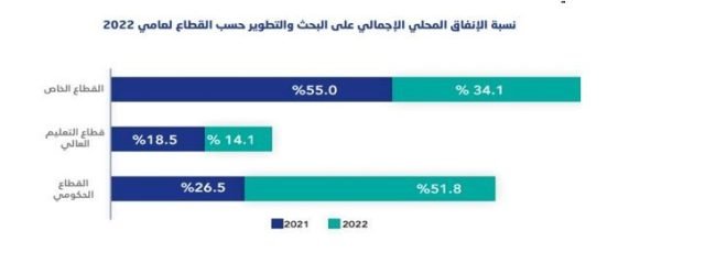 ويوضح الشكل رقم (2) نسبة الإنفاق المحلي الإجمالي على البحث والتطوير حسب القطاعات الثلاث : القطاع الخاص وقطاع التعليم العالي والقطاع الحكومي في العامين 2021م و2022م، ويوضح الشكل بأن القطاع الخاص شكل مانسبنه 55% من نسبة الإنفاق المحلي الإجمالي على البحث والتطوير في العام 2021م ،وانخفض مساهمات القطاع الخاص في العام 2022م لتصل إلى 34.1%، وكذلك القطاع الحكومي ارتفع نسبة مساهمته من 26.5% في العام 2021م لتتضاعف إلى حوالي 51.8%، ويبقى قطاع التعليم العالي متأخرا في الإنفاق مقارنة مع القطاعات الأخرى حيث شكل مانسبته 18.5% و 14.1% في العامين 2021م و 2022م على التوالي.