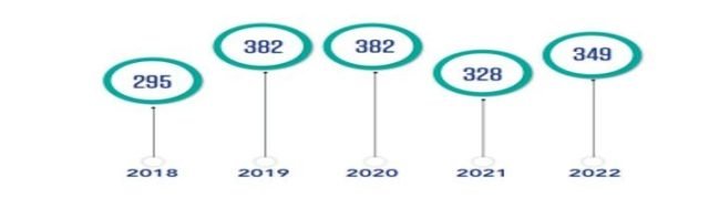 من خلال البيانات المتوفرة يوضح الشكل رقم (3) بأن عدد الباحثين المفرغين في سلطنة عمان كان 295 لكل مليون في العام 2018م ،وارتفع في العام الذي يليه إلى 382 لكل مليون نسمة. لتصل في العام 2022م إلى 349 لكل مليون نسمة.
