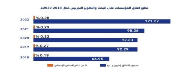 بلغ إنفاق المؤسسات في سلطنة عمان على البحث العلمي والتطوير التجريبي في عام 2018م حوالي 0.19% من الناتج الإجمالي المحلي بواقع 66.95 مليون ريال عماني ، وفي العام 2019م إرتفع الإنفاق إلى %0.27 من الناتج الإجمالي المحلي بواقع 92.29 مليون ريال عماني ، وبلغ في العام 2020م وفي خضم أزمة كوفيد واصلت الحكومة الإنفاق على البحث العلمي حيث بلغ 0.32% من الناتج الإجمالي بواقع 92.23 مليون ريال عماني، وقد وصل الإنفاق الحكومي الإجمالي في العام 2022م 0.29% بواقع 121.27 مليون ريال عماني.(شكل 1)