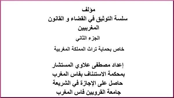 مؤلف سلسلة التوثيق في القضاء و القانون المغربيين الجزء الثاني خاص بحماية تراث المملكة المغربية اعداد : مصطفى علاوي حاصل على دبلوم المعهد العالي للقضاء حاصل على الإجازة في الشريعة جامعة القرويين فـــــــاس المغرب المستشار بمحكمة الإستئناف بفاس المغرب له العديد من المؤلفات رابط التحميل بصيغة PDF _____________ __GDRIVE_LABEL__ أخر المواضيع من قسم : اجتهادات قضائية تعليقات