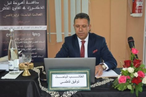ناقش الطالب الباحث توفيق فاطمي (مستشار بمحكمة الاستئناف بوجدة) يومه السبت فاتح اكتوبر 2022 بمدرج الندوات بكلية الحقوق بوجدة أطروحة لنيل الدكتوراه في القانون الخاص في موضوع:
